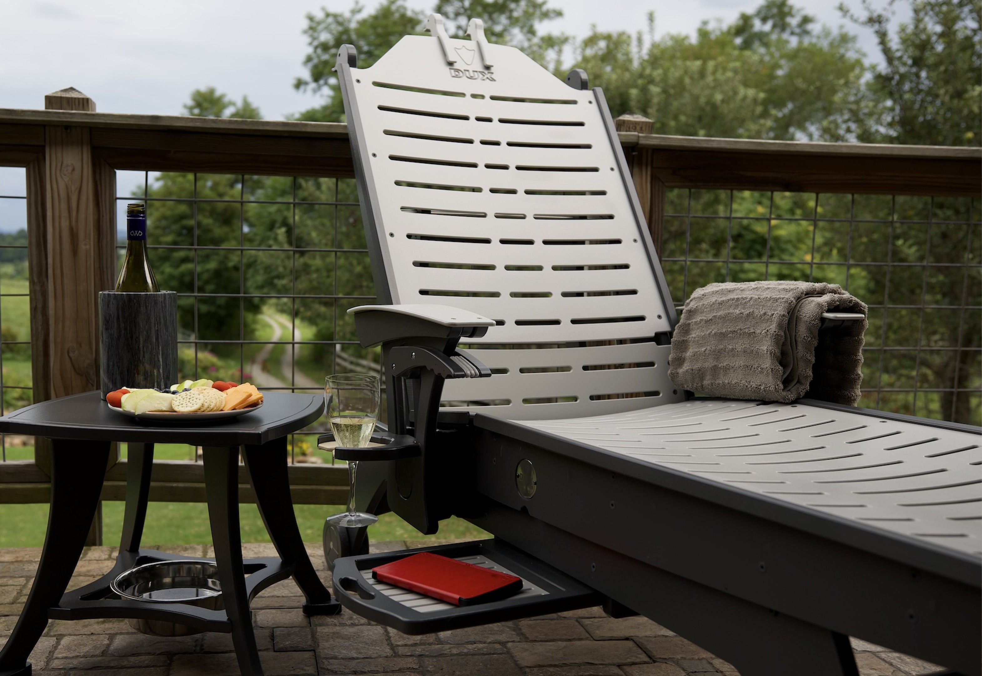 The DUX Chairs we have around our fire pit that include a wine glass holder and cup holder for an added bonus. They are so easy to roll across the ground to put them away when we were done using them around our firepit.